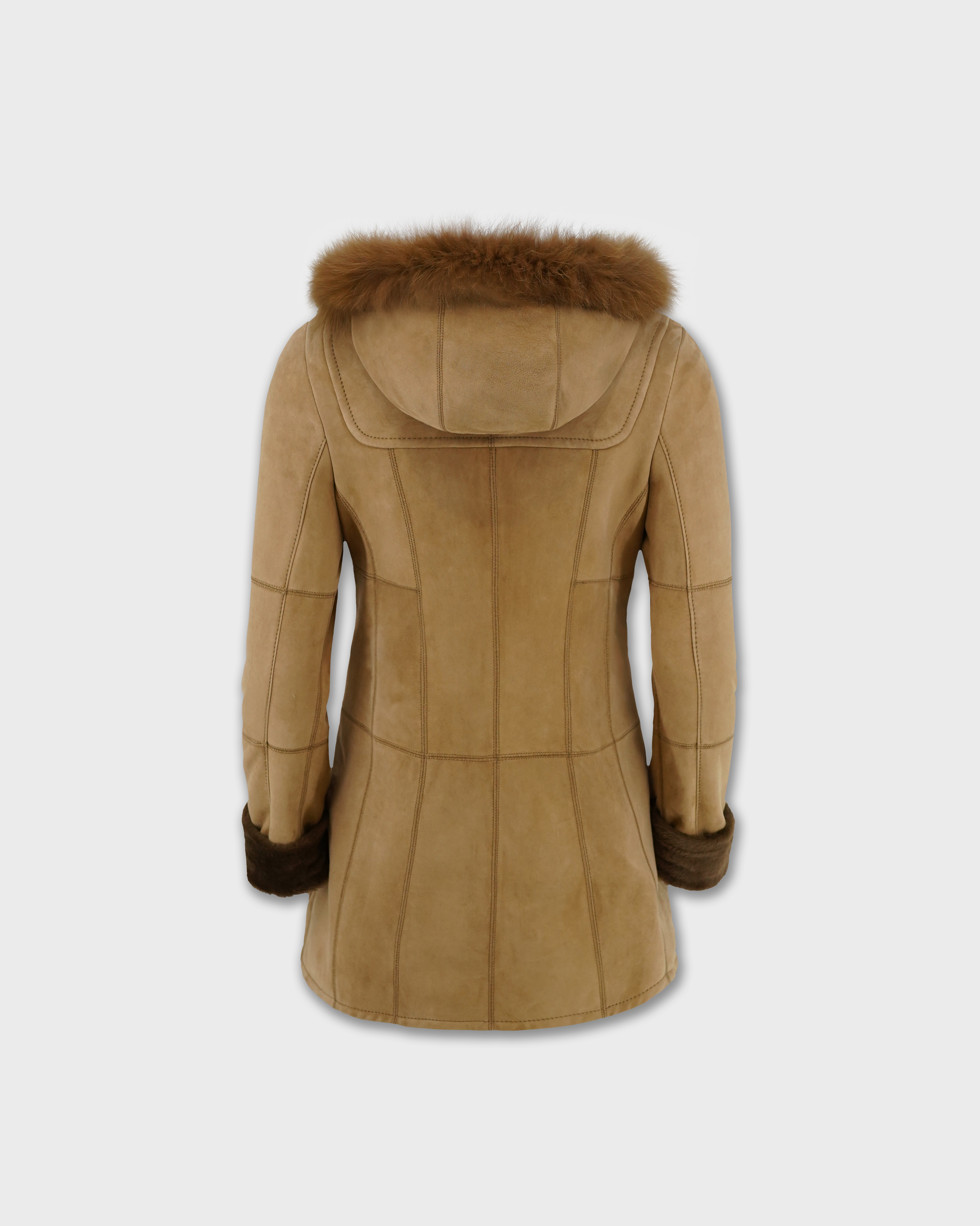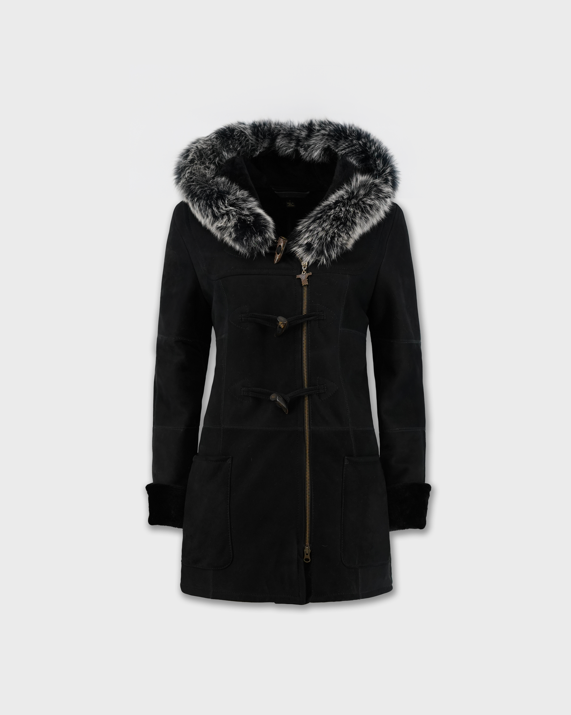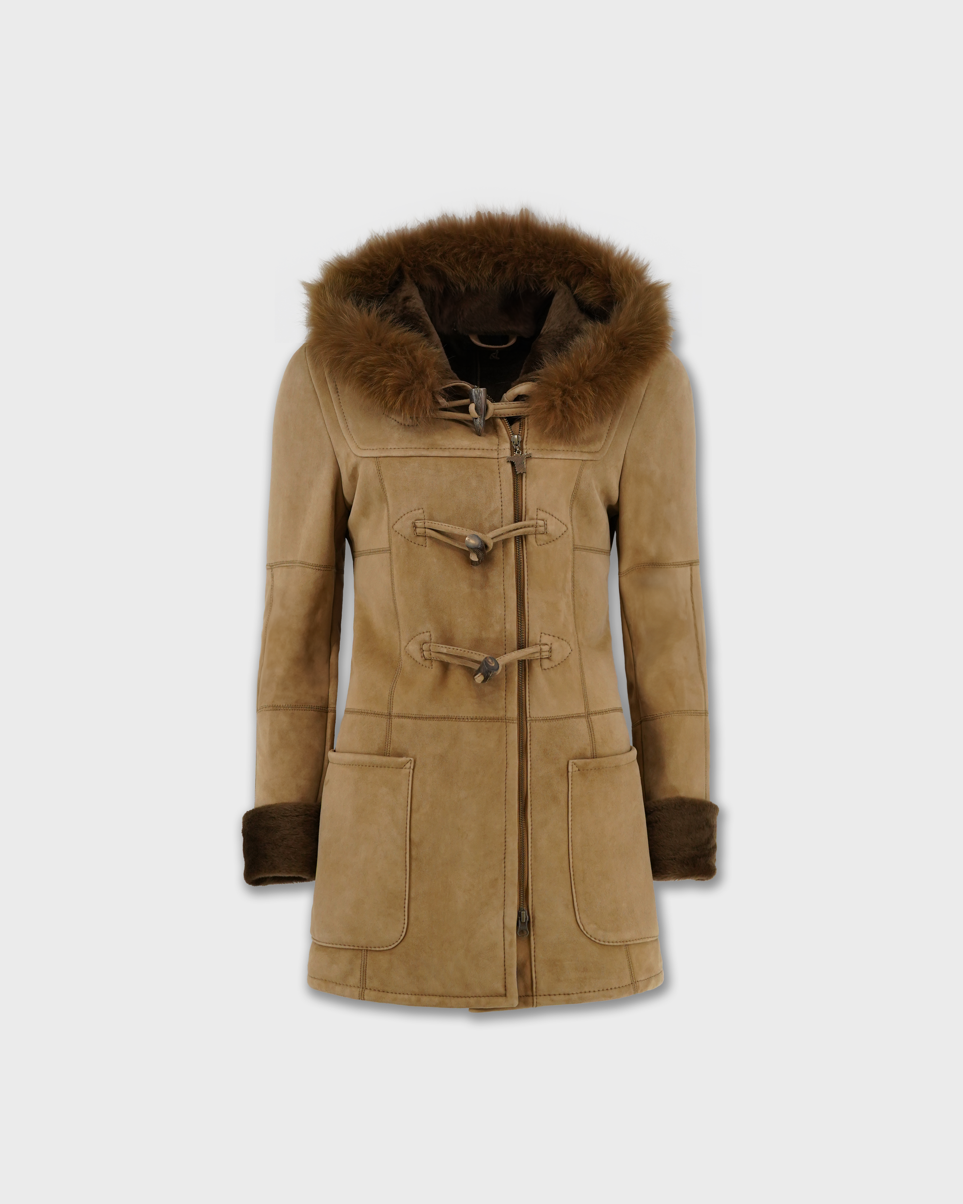 The Dulcie is a lightweight duffle style merino shearling jacket, handcrafted in New Zealand using 10mm shaved wool with a suede finish. This timeless jacket features horn toggles, open hand pockets, and fox fur trim on the hood to give a soft and luxurious feel. The Dulcie duffle is a wardrobe essential.