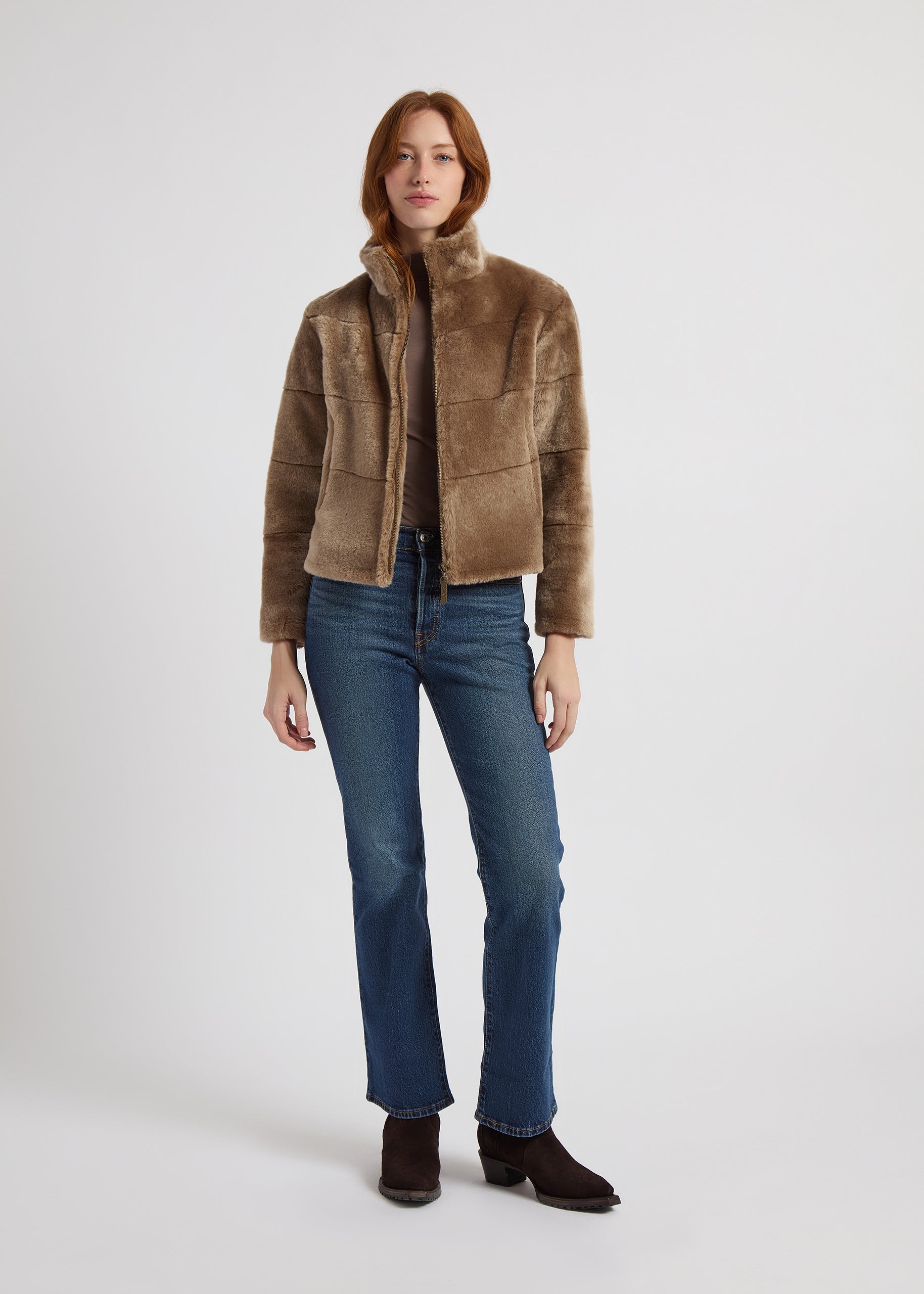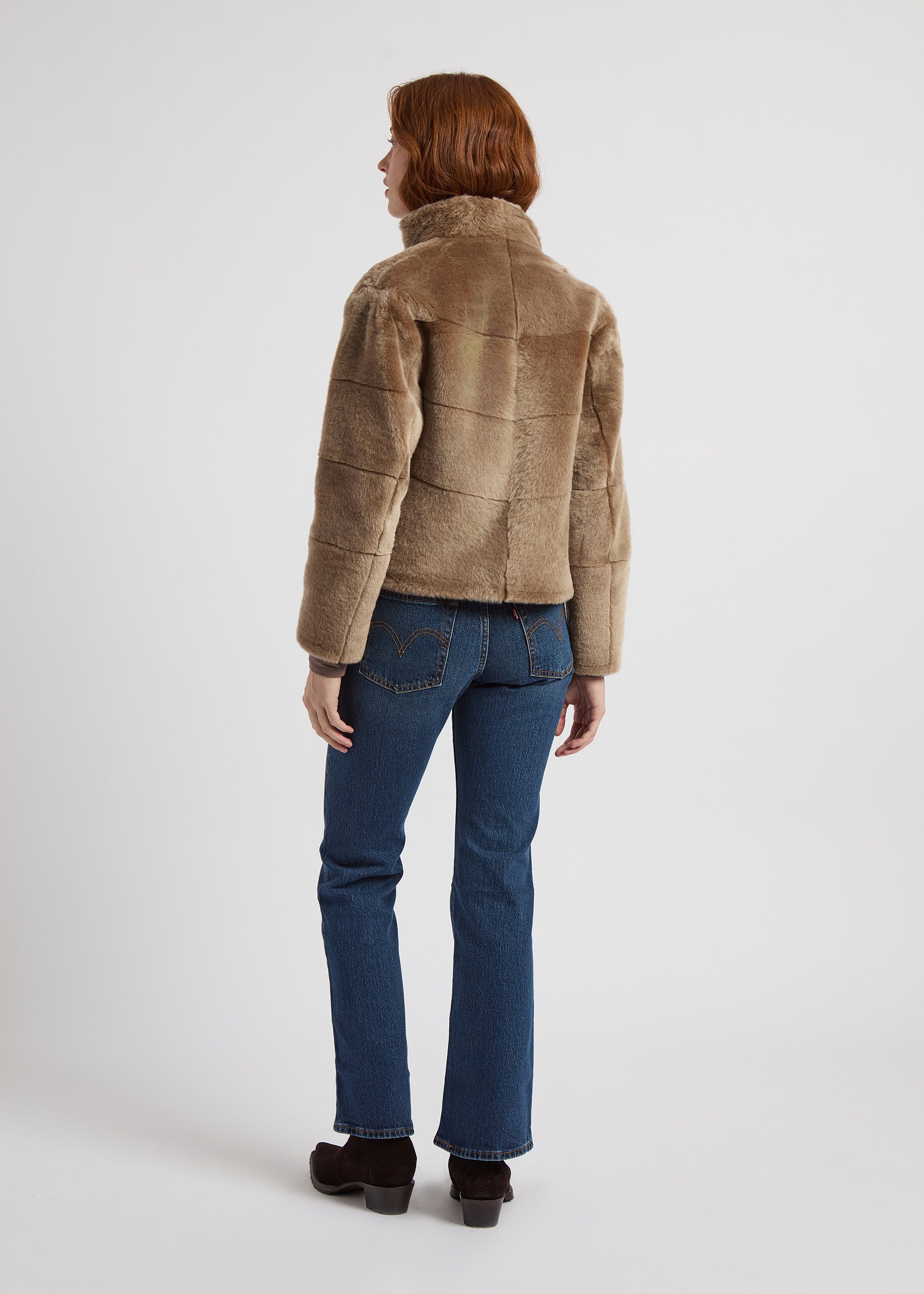 The Jackie is cut from plush shearling for a warm yet lightweight feel. Its high collar, hidden zip, and subtle slit pockets create a streamlined silhouette that transitions seamlessly from day to evening.